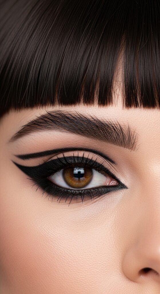 With such a strong focal point on your eyes, your makeup should enhance, not compete. Define your brows neatly—they peek out under the bangs and frame your eyes.