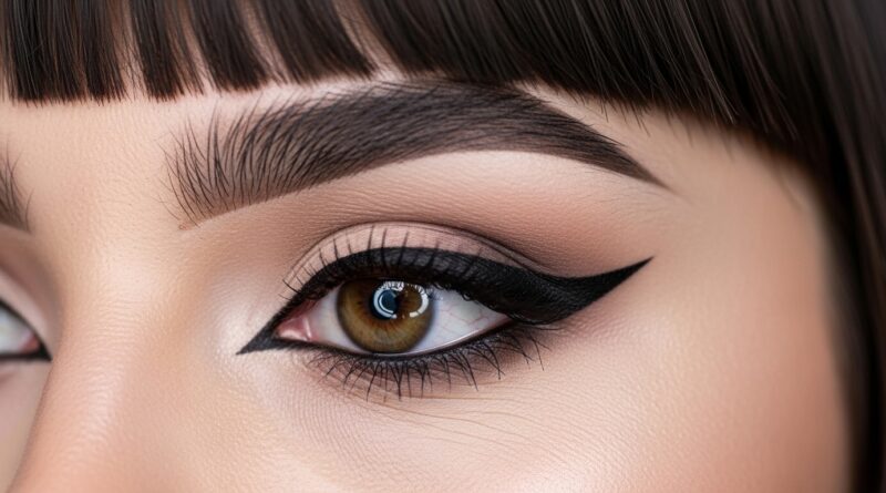 A classic winged eyeliner or well-defined lashes will make your eyes pop behind the fringe. Keep the lips more neutral, or go bold with a red lip for a full-glam effect.