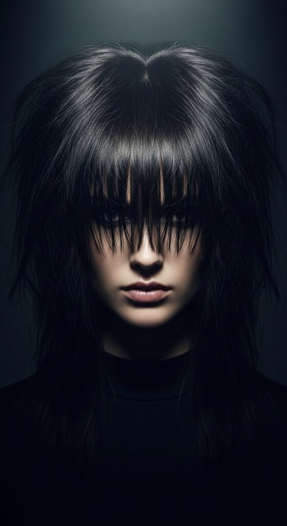 This version pairs beautifully with darker hair colors and has a slight vintage, vampire haircut allure. It’s mysterious, beautiful, and perfect for making a statement without saying a word.
