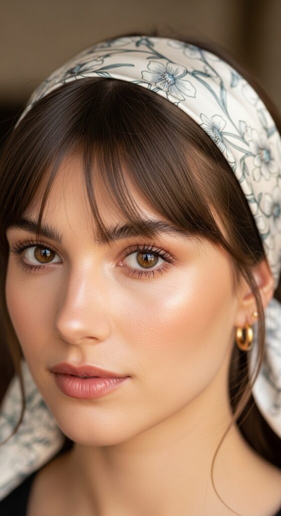Your fringe is already an accessory, so keep others simple. Thin headbands worn behind the fringe look chic. Small, delicate earrings shine since they don’t compete with your face-framing hair.