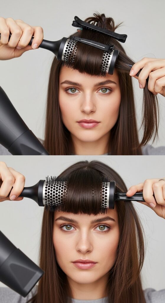 The signature bend is what makes this fringe look modern, not helmet-like. After blow-drying, use a flat iron or a large-barrel curling iron to create a soft curve away from your face.