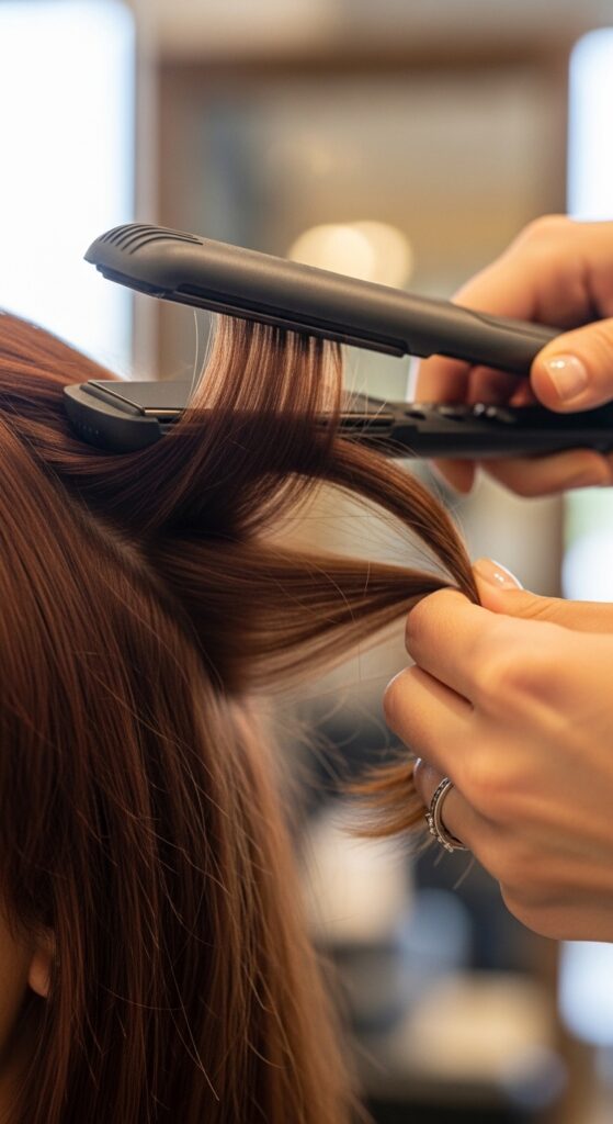 Clamp the iron mid-length on each curtain section and gently rotate it outward, just for a second. Don’t curl it all the way to the ends. You just want to break the line and add movement.