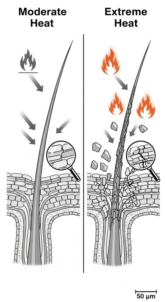 Hair is made of keratin, a protein that holds a delicate structure. Apply too much heat, and that structure melts and breaks permanently. That’s what causes split ends, brittleness, and that fried feeling.