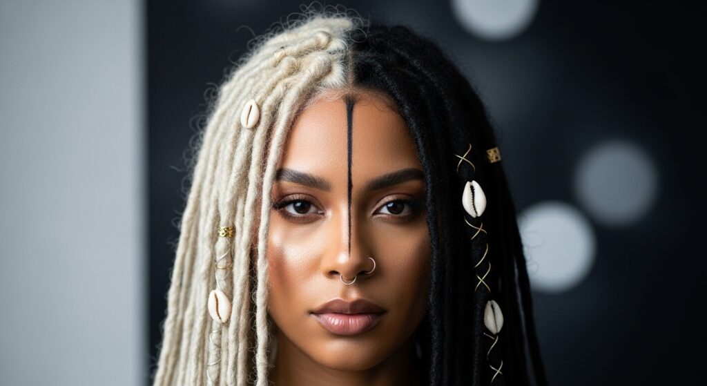 Inspired by the iconic vampire haircut, this style uses stark contrast. Picture deep black locs with a few strategically placed, bright blonde pieces around the face.