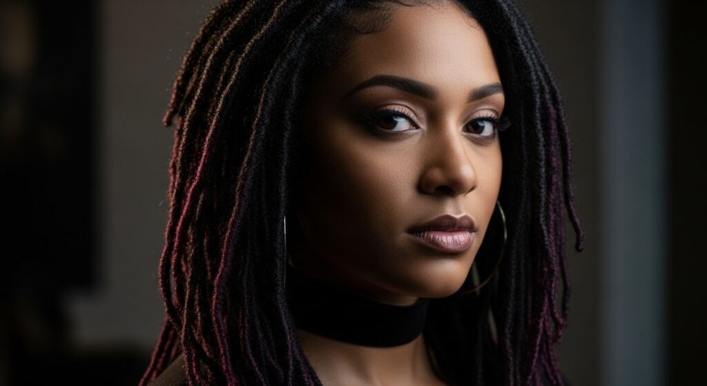 Merge the ethereal feel of goddess locs with a darker palette for a stunning romantic goth hairstyles moment. Imagine deep black locs with hidden shades of plum, wine, or even emerald.