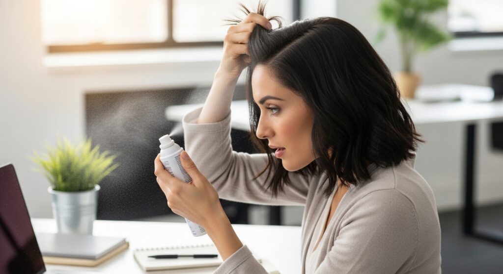 Carry a travel dry shampoo for a midday refresh. Just lift sections and spray a tiny bit at the roots, then massage it in.