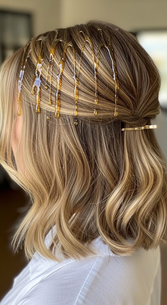 This smooths the cuticle for maximum shine, which makes those honey tones gleam. For an even sleeker finish, you can run a flat iron over it after. This style screams modern elegance and lets the color’s dimension take center stage.