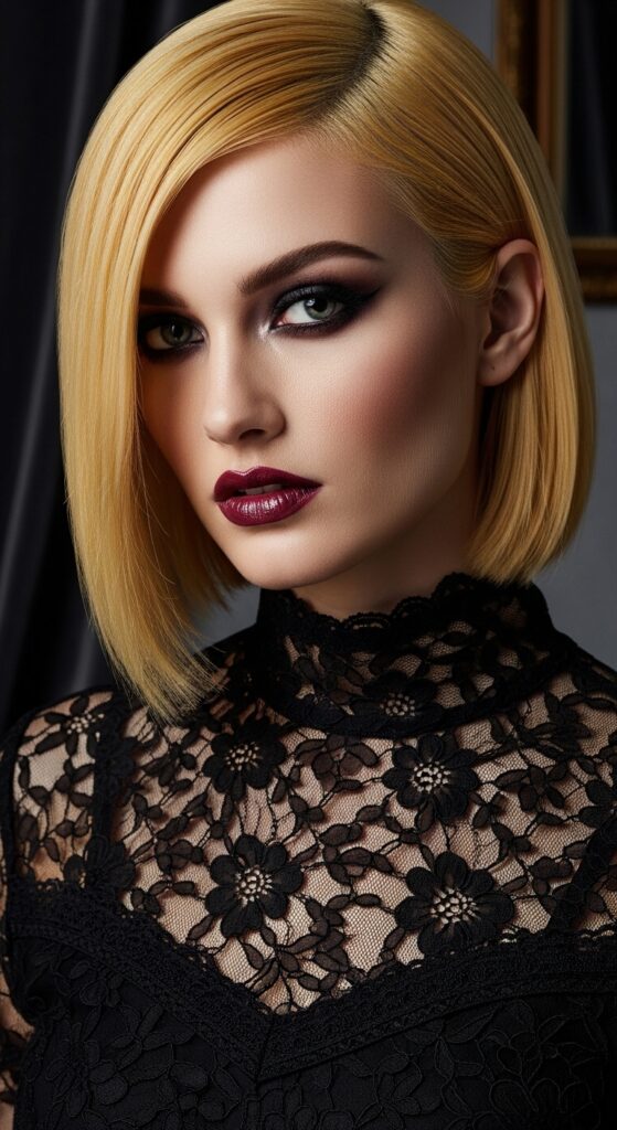 Now, hear me out. This warm color can actually create a stunning contrast with romantic goth hairstyles. Picture a deep side part, pin-straight sleekness, or intricate braids against this fiery gold.