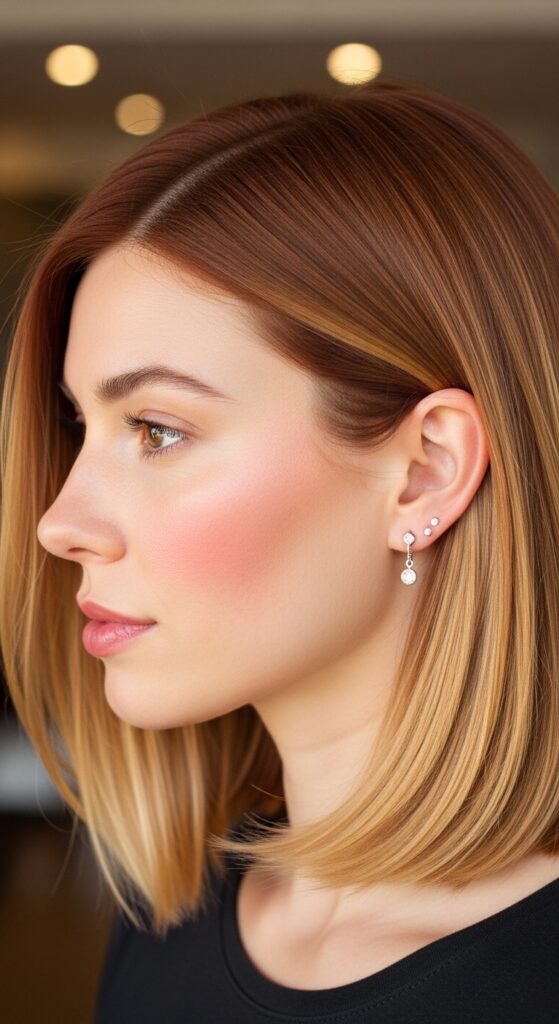 When the light hits the different lengths, it creates even more dimension in the saffron spice tones. It’s a fantastic way to personalize the classic lob and make it feel more “you.”