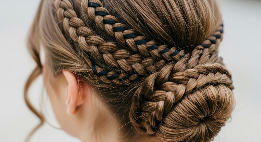Weave in a thin, black ribbon or a few faux pearls as you braid. Leave a few face-framing pieces loose for a soft, undone feel. It’s structured yet romantic, with a touch of drama.