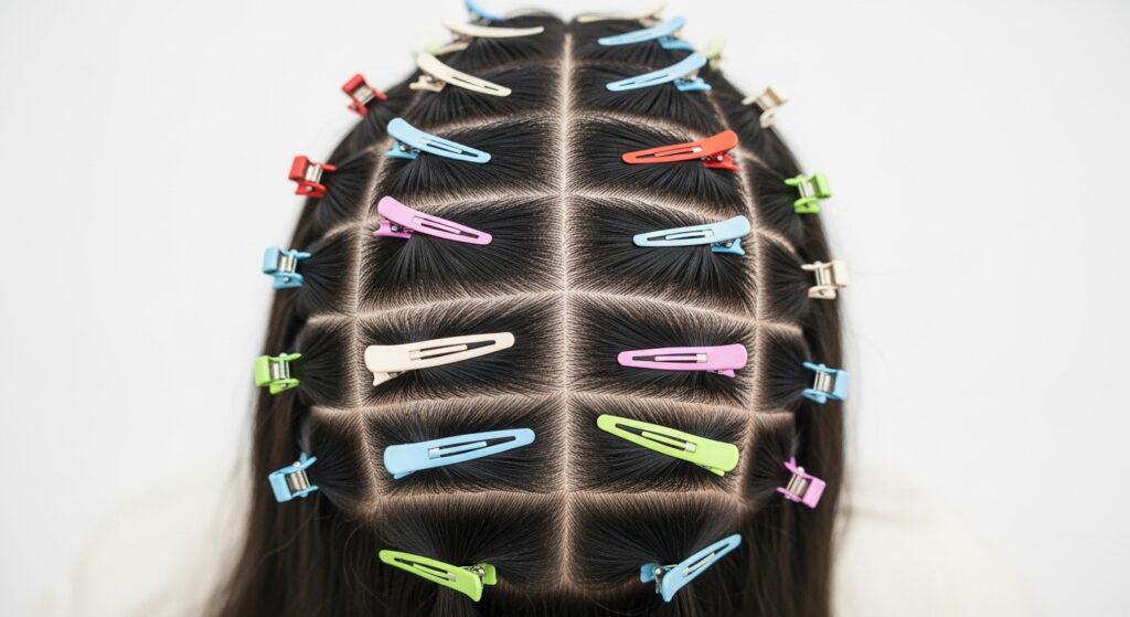 This gives you four quadrants. Then, part each quadrant into six smaller, even sections. Clip the hair you’re not working with out of the way. It seems meticulous, but it saves time and hassle later.