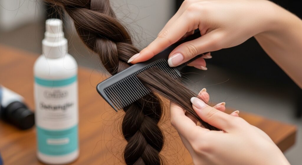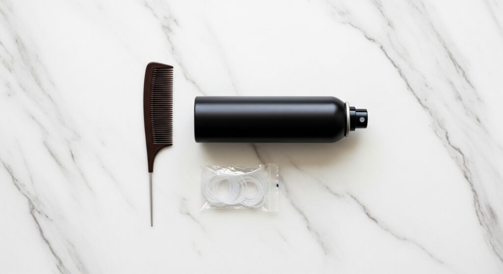 A strong-hold hairspray (but not one that makes hair crunchy), a fine-tooth tail comb for clean parts, and small, clear elastic bands. That’s it. The right tools make the process faster and the results so much better.
