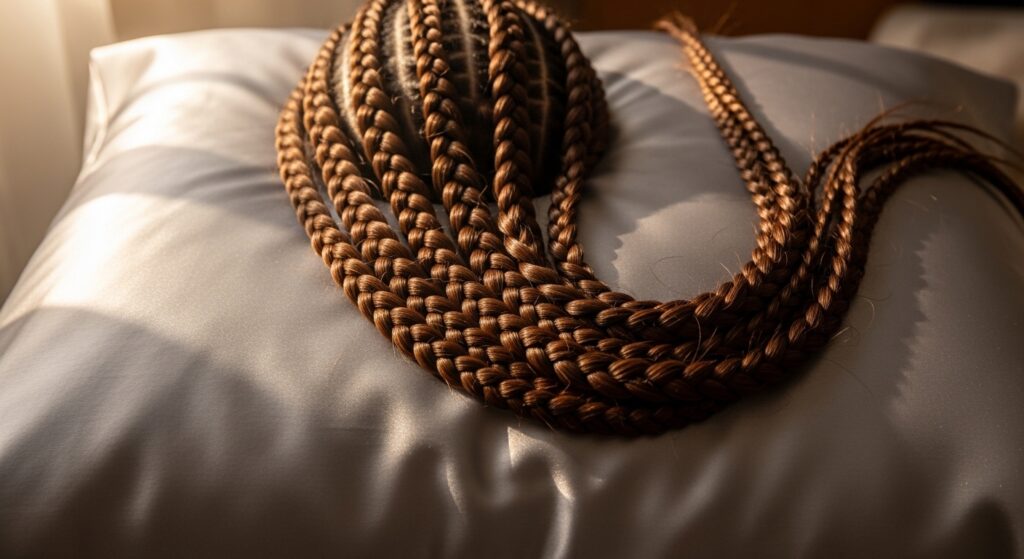 Want your braids to look great on day two? Sleep on a satin or silk pillowcase. It creates less friction than cotton. You can also loosely gather all the braids into a low, soft ponytail or a loose bun on top of your head.