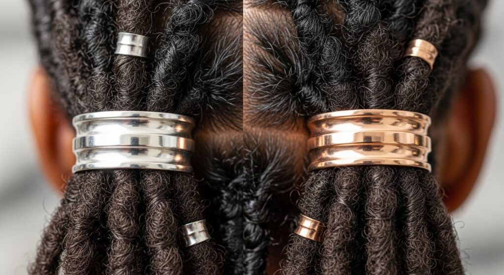 Choose cuffs that are the right size—they should be snug enough not to slide off easily but loose enough that you can rotate them slightly around the loc. They should never feel tight or pinch your hair. If you have to force it, it’s too small.