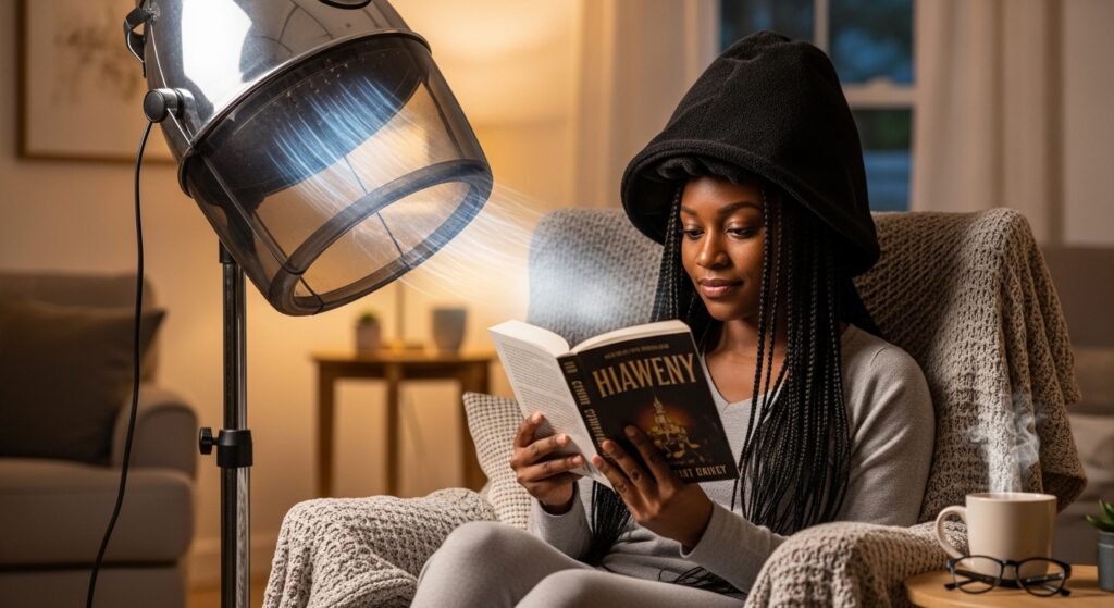 Then, sit under a hooded dryer on medium heat for at least 45 minutes to an hour. Yes, it’s a time commitment, but it ensures your scalp and the base of each braid is completely dry.