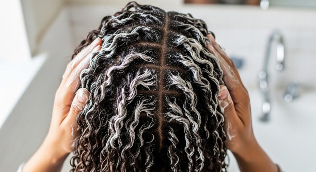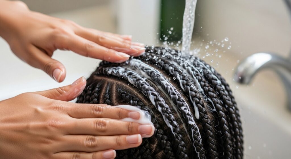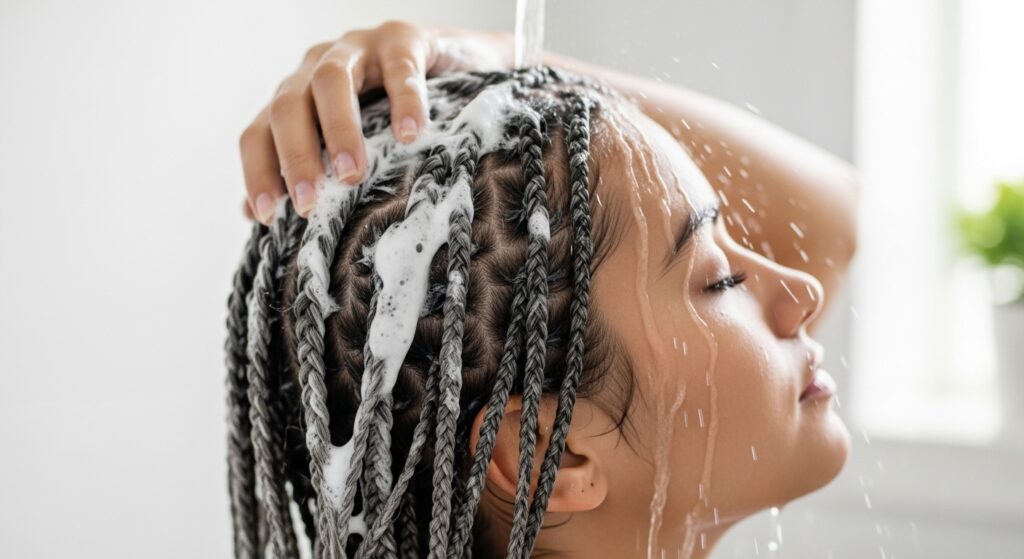 Focus on the length of the braids, avoiding the roots to prevent buildup. Let it sit for a few minutes while you do other shower things, then rinse with cool water to seal the cuticle and add shine.