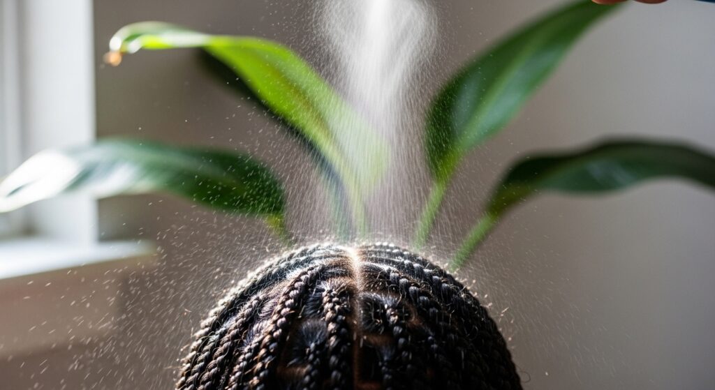 - Lightly mist your braids with a water and leave-in conditioner mix.