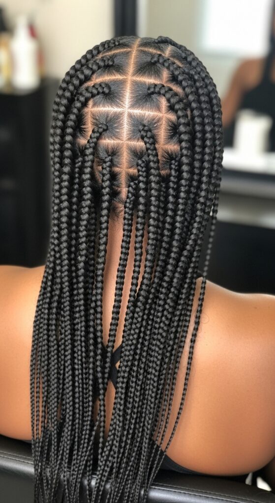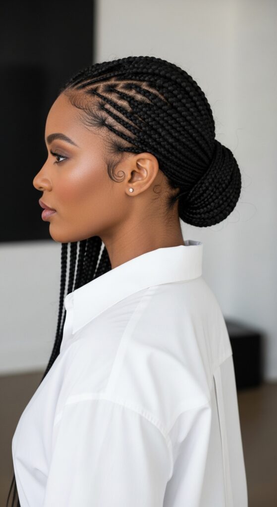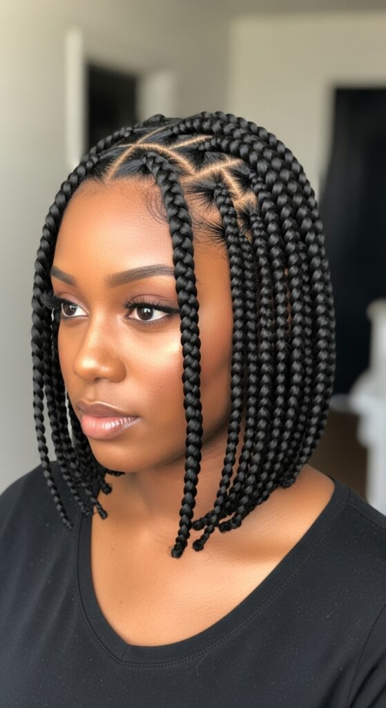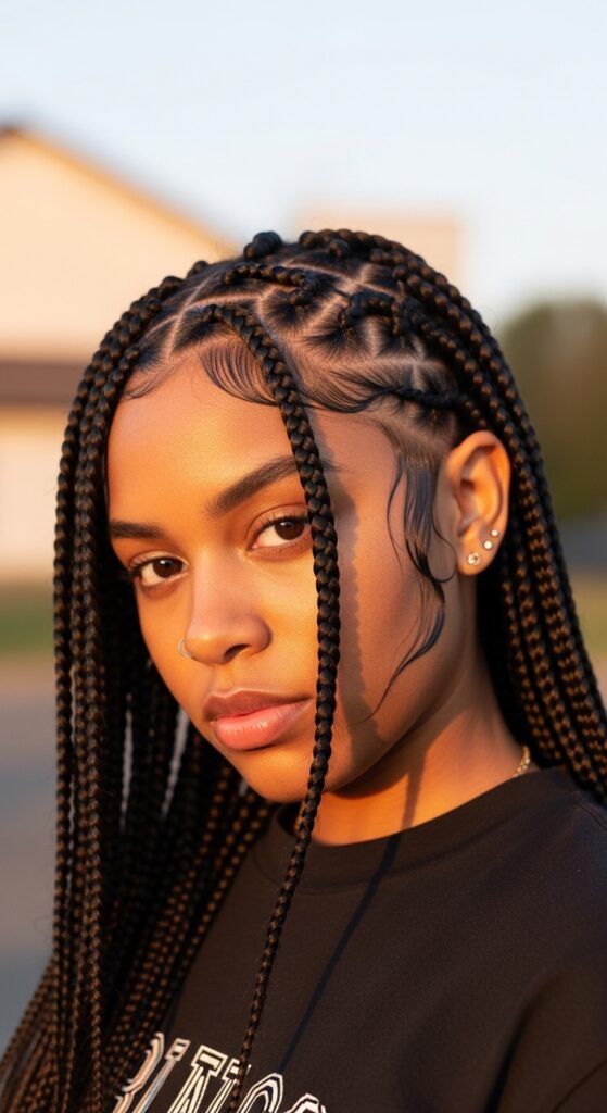 This style looks especially polished when the braids are perfectly moisturized and smooth, highlighting the sharp lines of the cut.