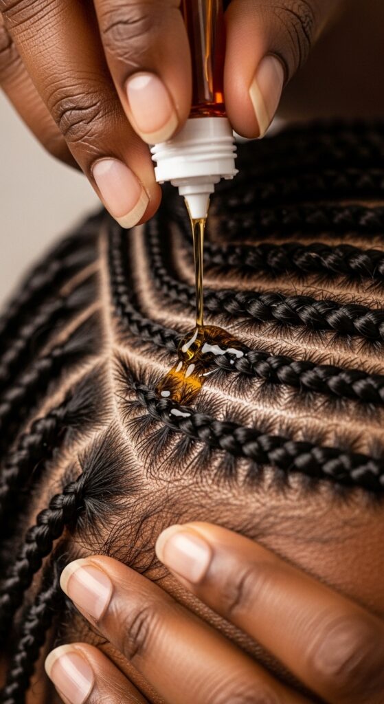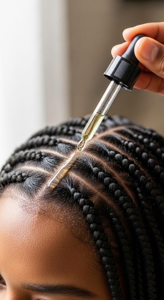 Once a week, you need a dedicated session. This isn’t a quick spritz. Section your braids as best you can. Using a dropper or your fingertips, apply your oil blend directly to your parts.