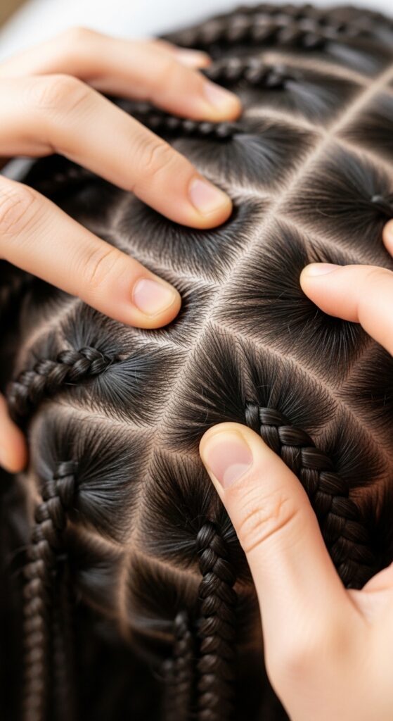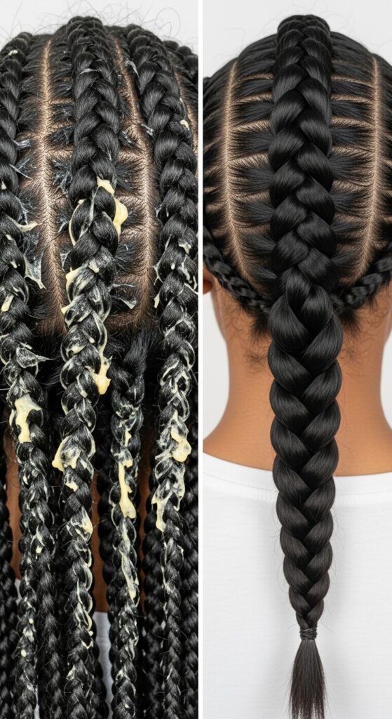Frizz happens when the hair inside the braid shrinks from dryness. Consistent oil infusion is your best weapon. Well-moisturized hair stays elongated and smooth inside the braid.