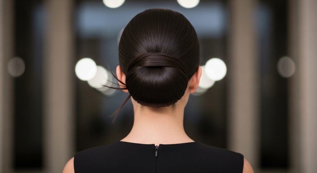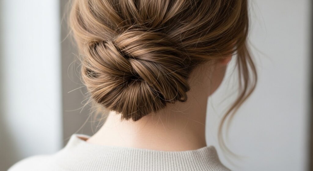 Think of this as the messy bun’s more sophisticated cousin. Make a low ponytail. Twist it tightly and coil it flat against your head at the nape, pinning as you go. Don’t worry about perfection—loose pieces are good.