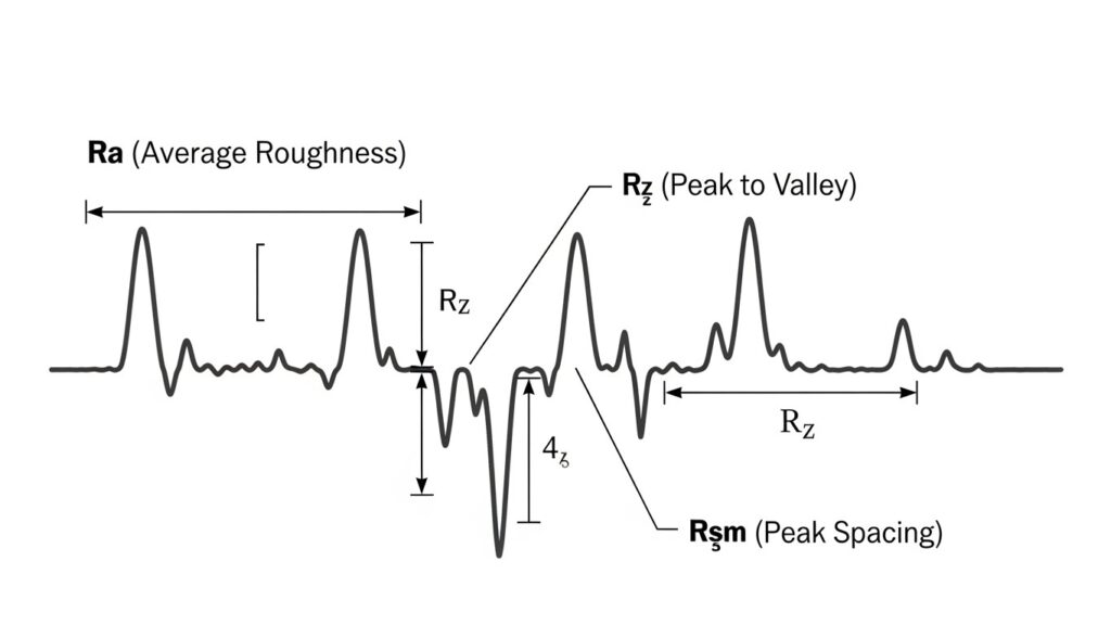 Rz (Mean Peak-to-Valley Height): Averages the heights of the highest peaks and deepest valleys.