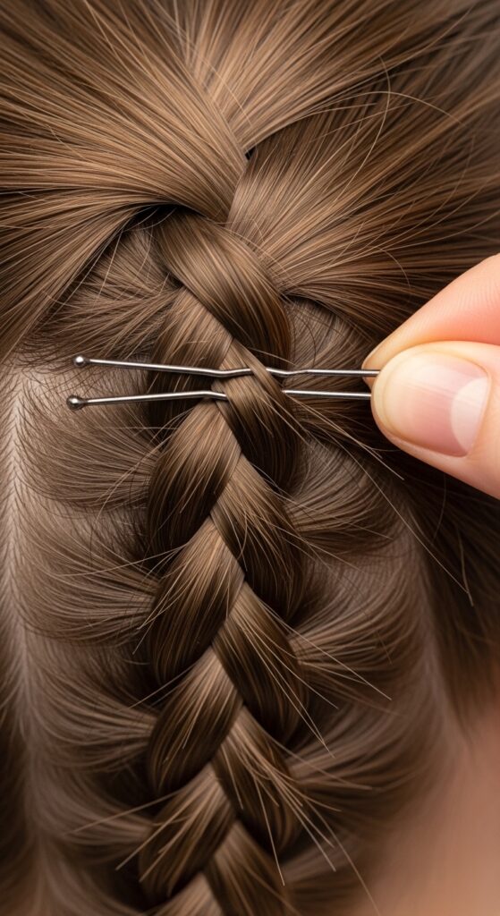 Now, use your bobby pins to secure the braid. Slide the pins in vertically or criss-crossed, catching both the braid and the hair underneath. Use more pins than you think you need, especially at the start and end of the braid.