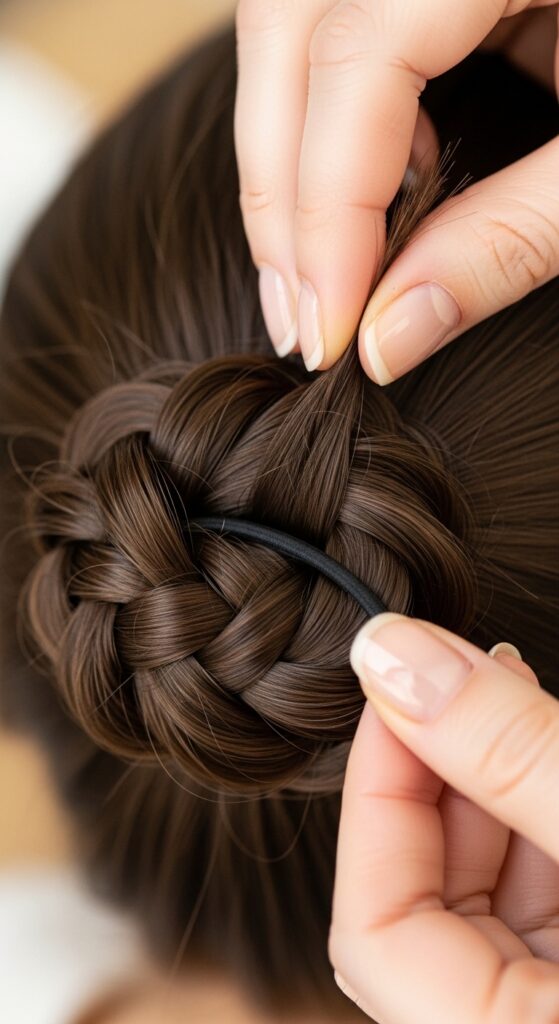 Those elastic bands at the ends of your braids need to disappear. Carefully tuck the ends under the wrapped braids, using bobby pins to secure them flat against your head. You can also gently pull a few tiny hairs out of the elastic to camouflage it.