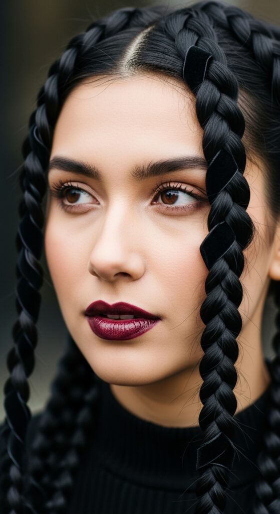 This is where milkmaid braids meet romantic goth hairstyles. Start with deep, dark hair color. After fluffing the braids, weave in a single strand of black velvet ribbon or a delicate chain.