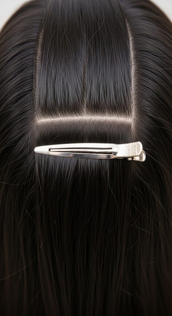 Secure one side with a clip or loose elastic so it’s out of the way while you work on the first braid. This keeps things manageable and prevents the sections from getting mixed up.
