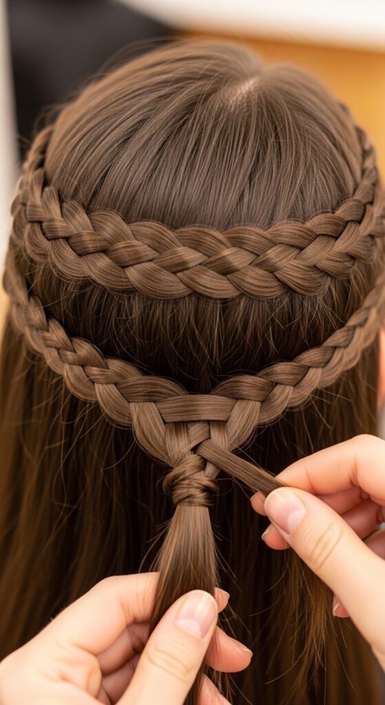 Take the second braid and bring it up to meet the first. You’ll wrap it around your head, just behind the first braid, so they sit parallel like a double crown. Tuck the end of this braid under the tail of the first braid.