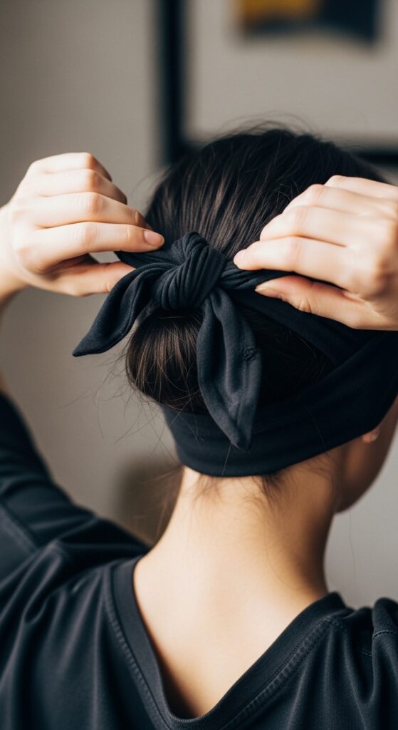 Take the two sleeves and tie them once at the front, over your forehead. Then, take the bottom hem of the shirt and tuck it upwards into the knot you just created.