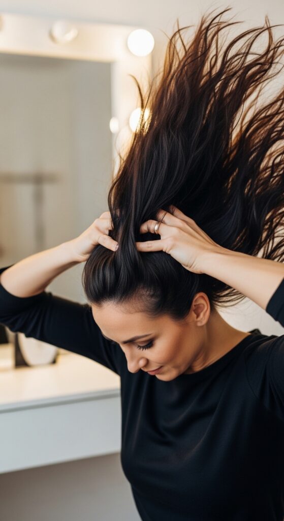 After taking the plop down, immediately flip your head over and gently shake your roots at the scalp with your fingers. Then flip back and let it be.