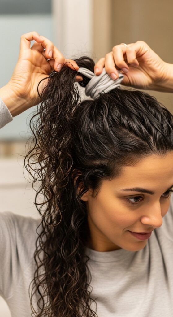 Then, right before bed, do a “dry plop” with a satin scarf or bonnet. Gently gather your dry-ish curls on top of your head and secure the scarf to preserve volume and prevent friction.