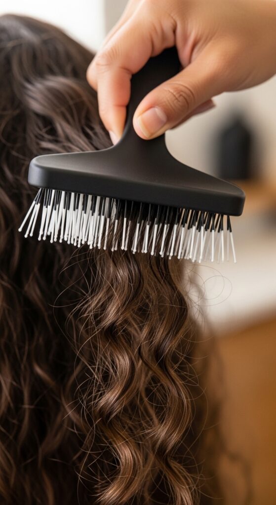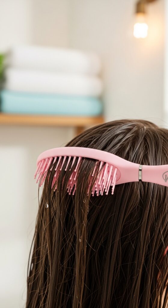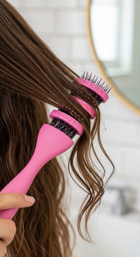 Use a gentle brush like The Wet Brush or a wide-tooth comb. Working in sections is key here too. This approach is great for when you’re styling your damp hair, perhaps for heat-free waves or a sleek air-dry.
