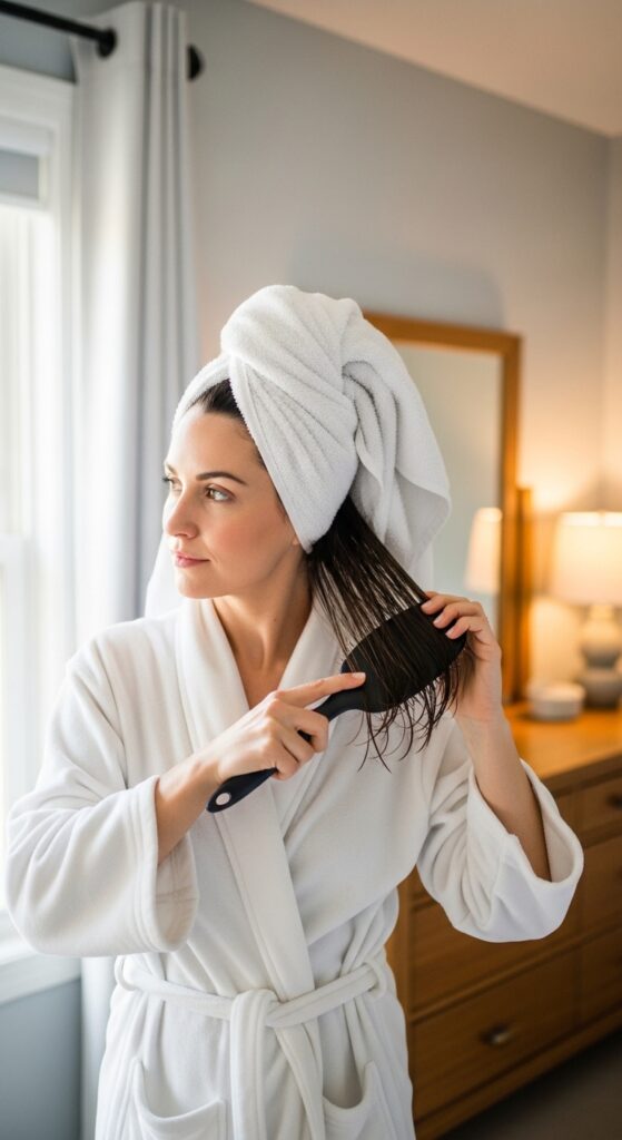 If you prefer to detangle after your shower, your hair should still be very damp. Use a microfiber towel to gently squeeze out water—never rub. Then, apply a leave-in conditioner or detangling spray for extra slip.