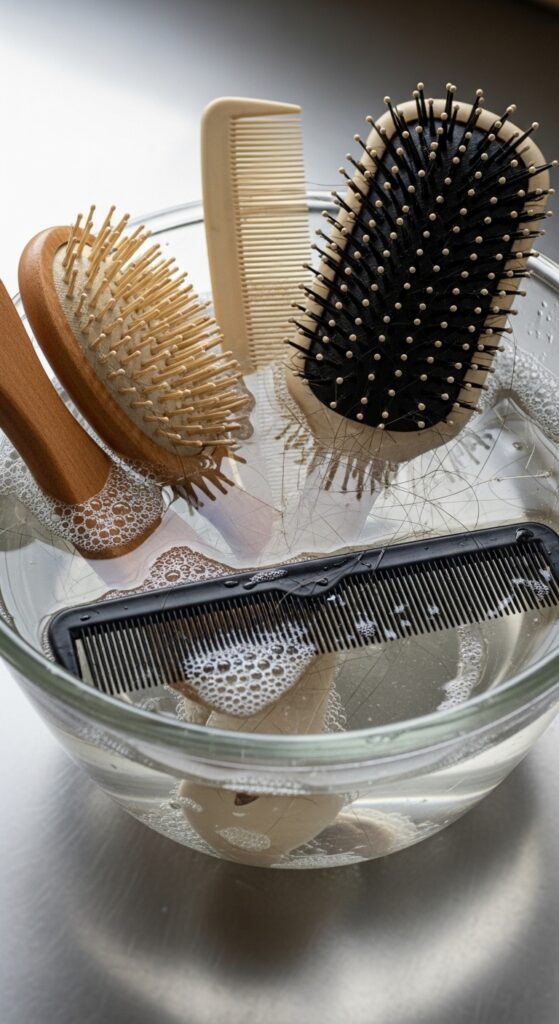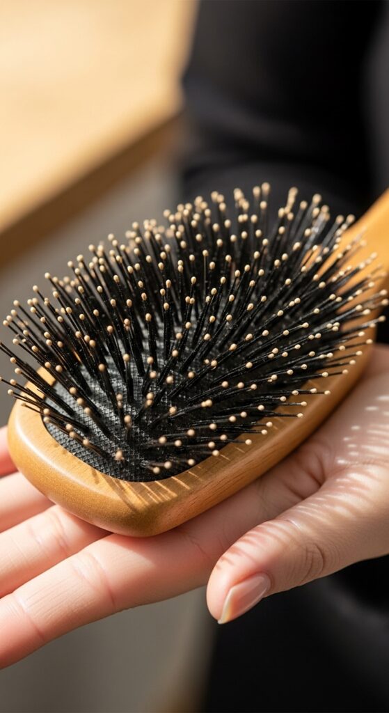 Gently scrub the bristles with an old toothbrush, rinse thoroughly, and let them air dry completely upside down. This removes old product, oil, and dust that can weigh your hair down.