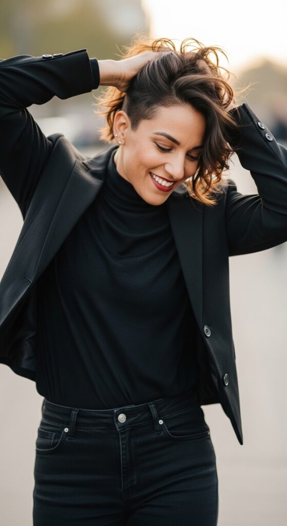 This haircut acts like the ultimate accessory. It looks amazing with crisp collars and blazers, playing up that edgy yet professional vibe.