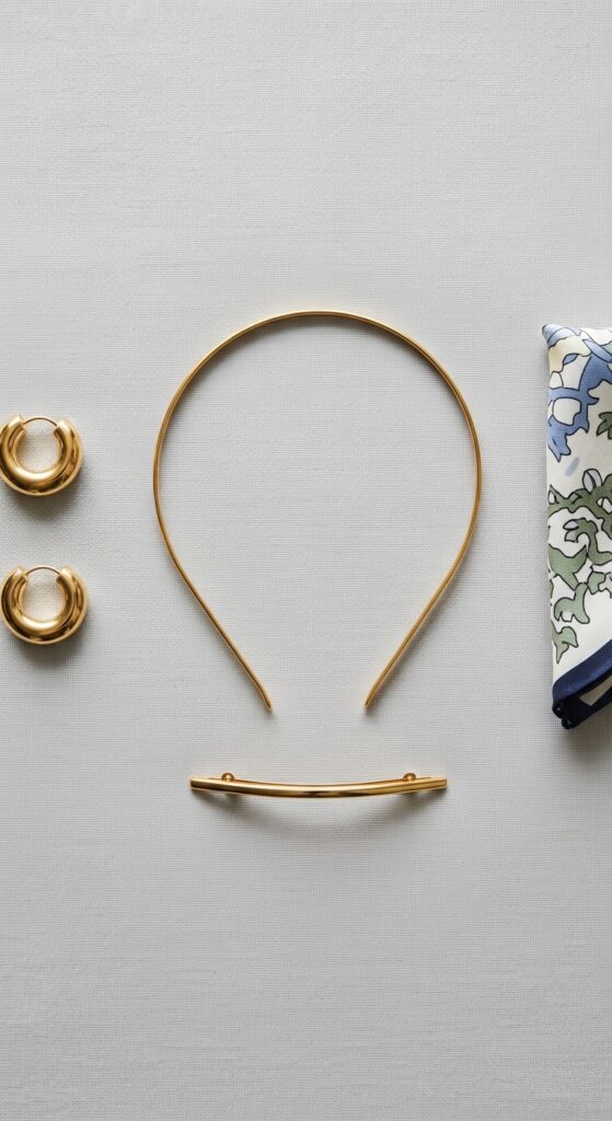 - A silk scarf tied as a headband for a vintage touch.