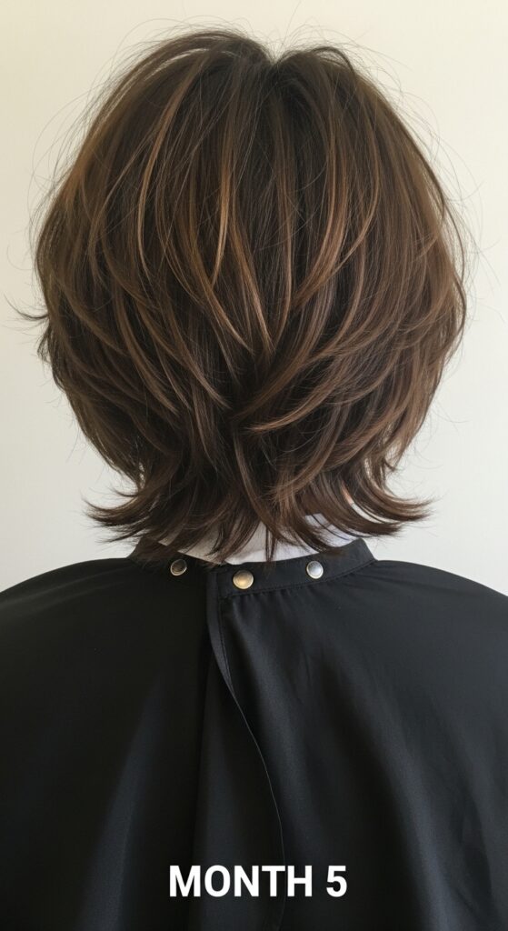 The beauty of this cut is it grows out into a fantastic shag or layered bob. To manage the awkward phase, keep getting the neckline trimmed to keep it shapely.