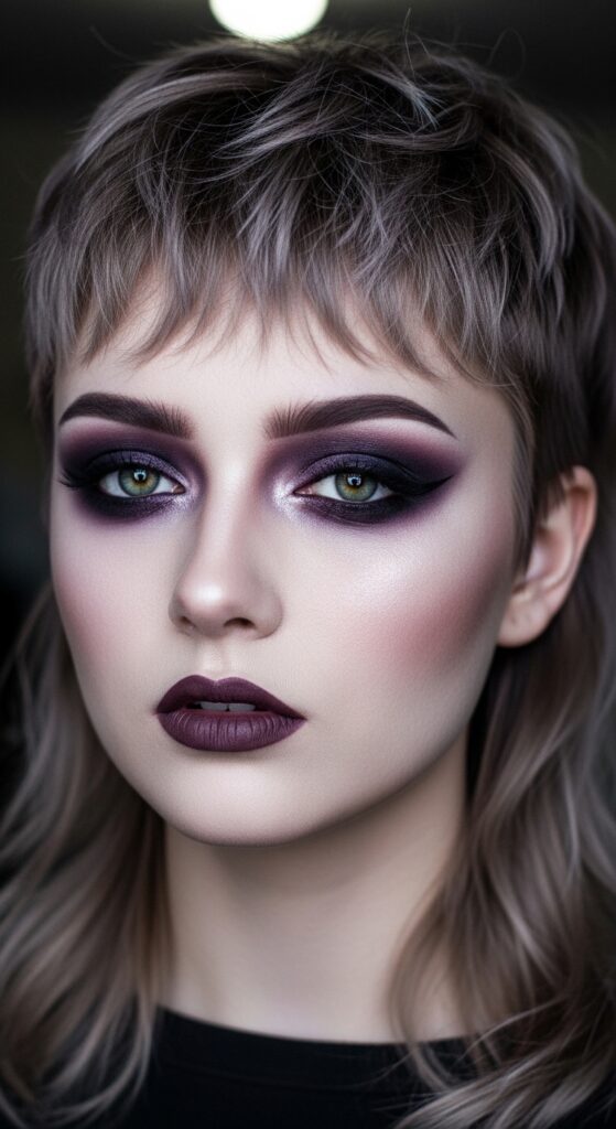 This haircut is a dream for playing with aesthetic contrasts. For an edgy yet professional look, try a romantic goth makeup vibe. Think a smudged, soft brown liner, flushed cheeks, and a deep berry lip.