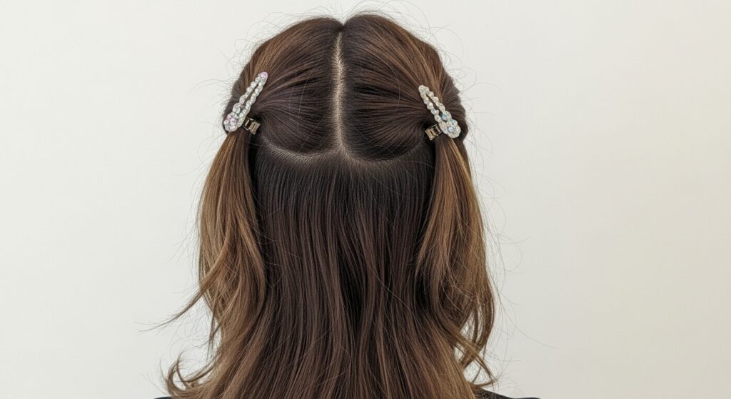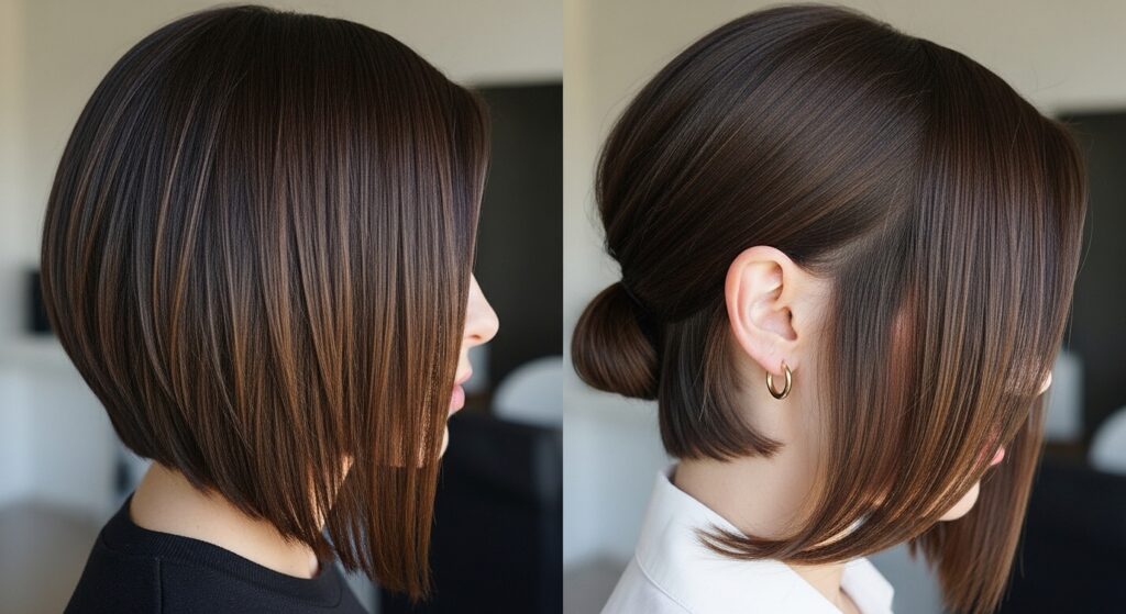 You can also do a half-up style, pulling just the top section back with a simple clip. This keeps hair out of your face but shows off the cool shape in the back. It’s professional but interesting.