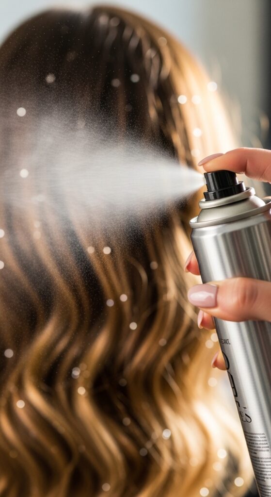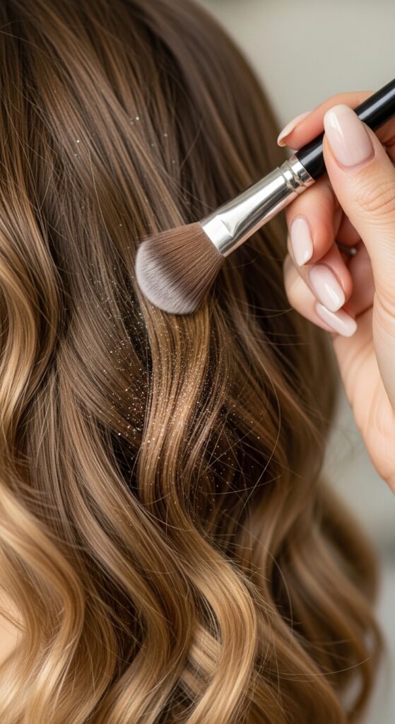 Carry a travel-size spray for touch-ups. Avoid running your fingers through your hair too much. The goal is to let the sparkle sit on the surface.
