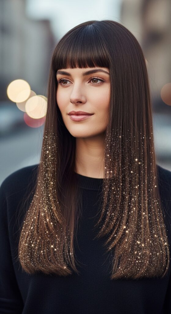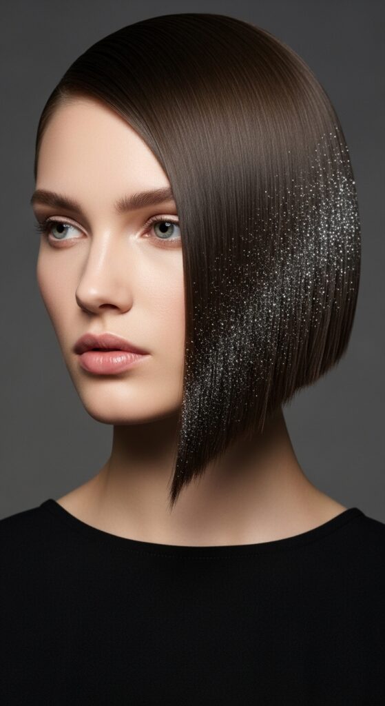 This isn’t just for long hair. A sleek quiet luxury bob becomes instantly edgy with a dusting of sparkle along one side or just at the blunt ends.