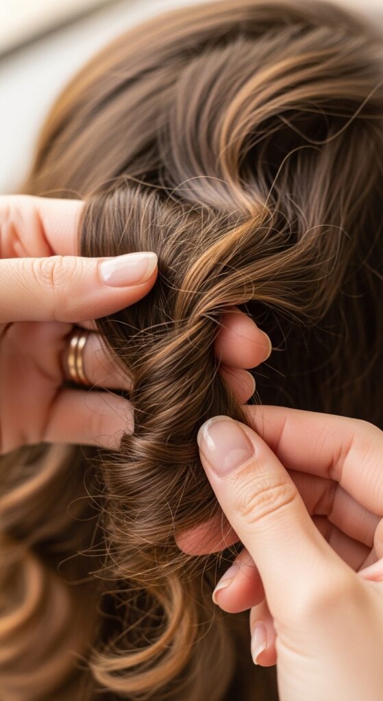 The top sections are the most visible, so be extra neat here. For the front pieces around your face, consider the direction of the curl.