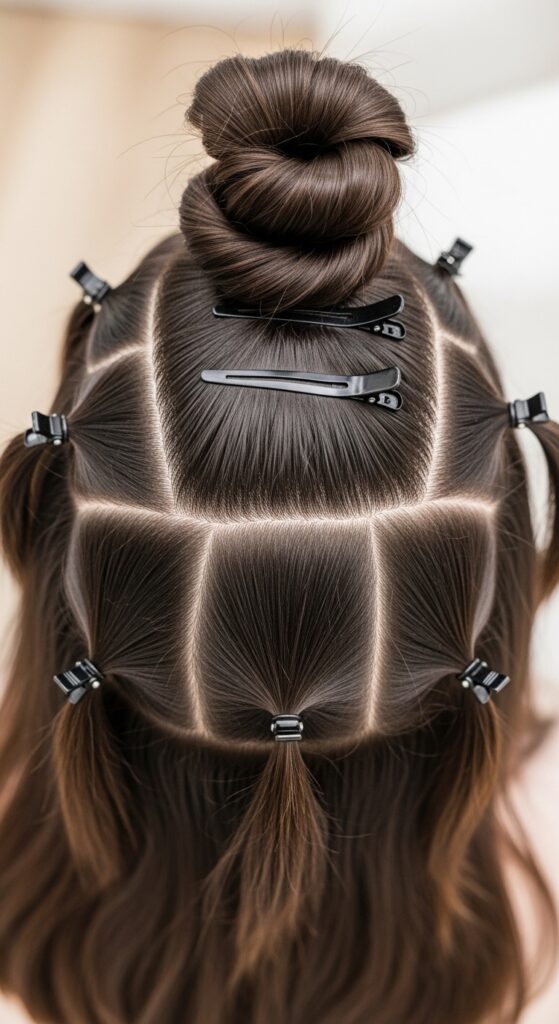 Then, clip the top half of your hair up and out of the way. You’ll work on the bottom layer first. Within that bottom layer, create small, horizontal sections about 1-2 inches wide. Smaller sections mean tighter, more defined curls.