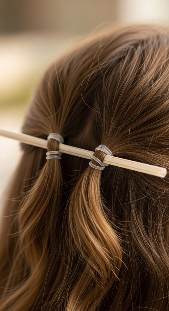 For very long hair, you might need to wrap a bit more loosely so the straw can hold the weight, or use two straws connected end-to-end for extra length. The principle is exactly the same.