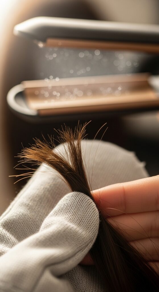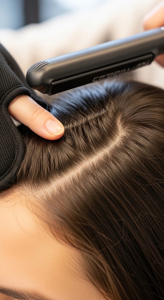 For the final pass, use your flat iron with the mitt. Hold a thin section taut with the mitt, and glide the iron down slowly. The mitt lets you pull the section completely straight without burning your fingers, sealing the cuticle for insane shine. It’s the secret to that “effortlessly perfect” vibe.