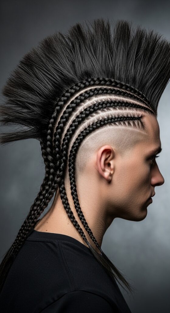 Not the punk-rock shaved look, but a styled mohawk where the center section is raised. In this hybrid, that center section is made up of multiple, bold interlaced cornrows.