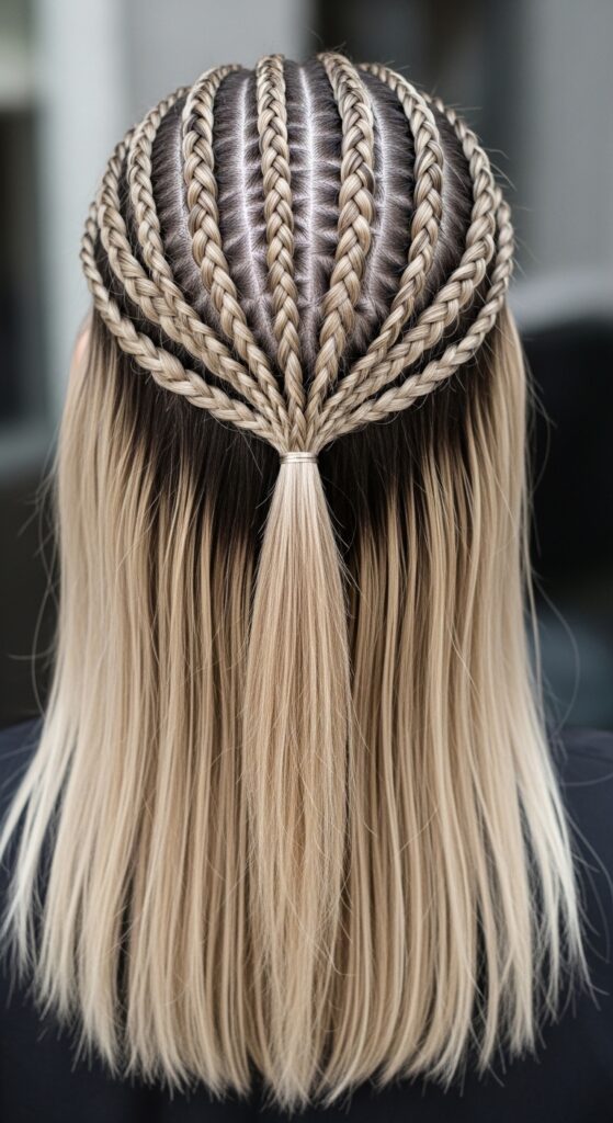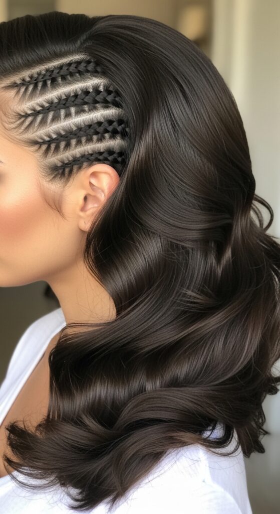 The braids can sweep across the forehead like a headband or run parallel to the part. It’s red-carpet ready, offering both drama and intricate beauty.